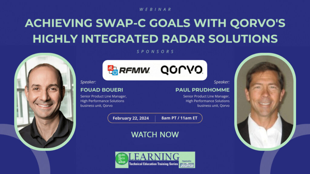 In this on-demand webinar recording, expert speakers Paul Prudhomme and Fouad Boueri, of Qorvo’s Defense and Aerospace business, will provide an in-depth look into the critical aspects of Size, Weight, Power and Cost (SWAP-C) optimization in modern aerospace and defense systems, focusing on Monolithic Microwave Integrated Circuit (MMIC) Transmit/Receive (T/R) modules and Spatium Solid State Power Amplifiers(R) (SSPAs). Qorvo’s expert speakers will explore the latest advancements in MMIC technology and T/R modules including the design, benefits and integration into complex systems such as radar, communication, and electronic warfare systems.