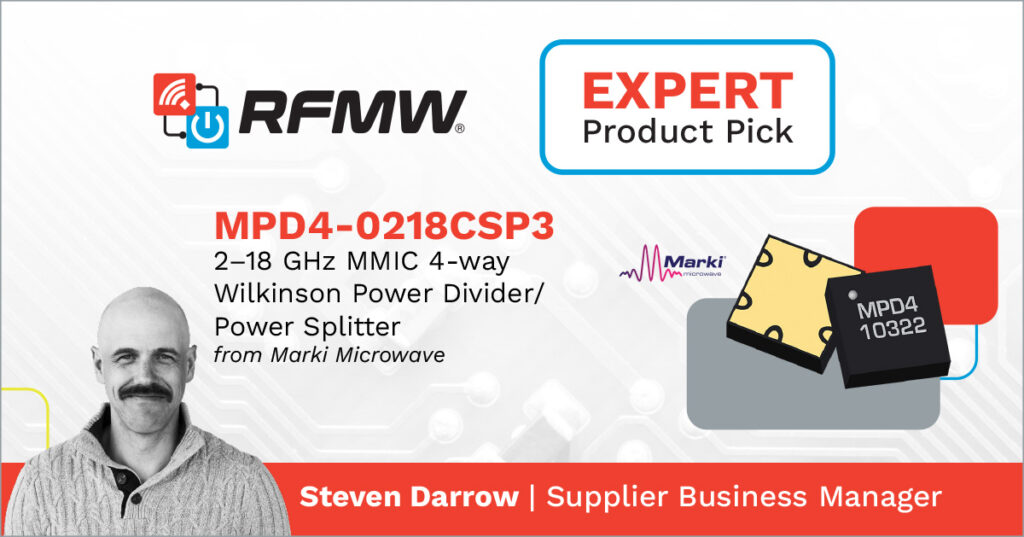 I selected the Marki Microwave MPD4-0218CSP3, a 2–18 GHz MMIC 4-way Wilkinson power divider/power splitter, for this Expert Product Pick because of its outstanding combination of performance and miniaturization. One of the toughest challenges RF engineers face today is balancing high-frequency performance with reduced size, weight, and power consumption. Traditional PCB-based Wilkinson designs are bulky and introduce variation, which makes it difficult to meet the demanding requirements of radar, EW, and satellite communication systems that prioritize low SWaP without sacrificing precision or repeatability.